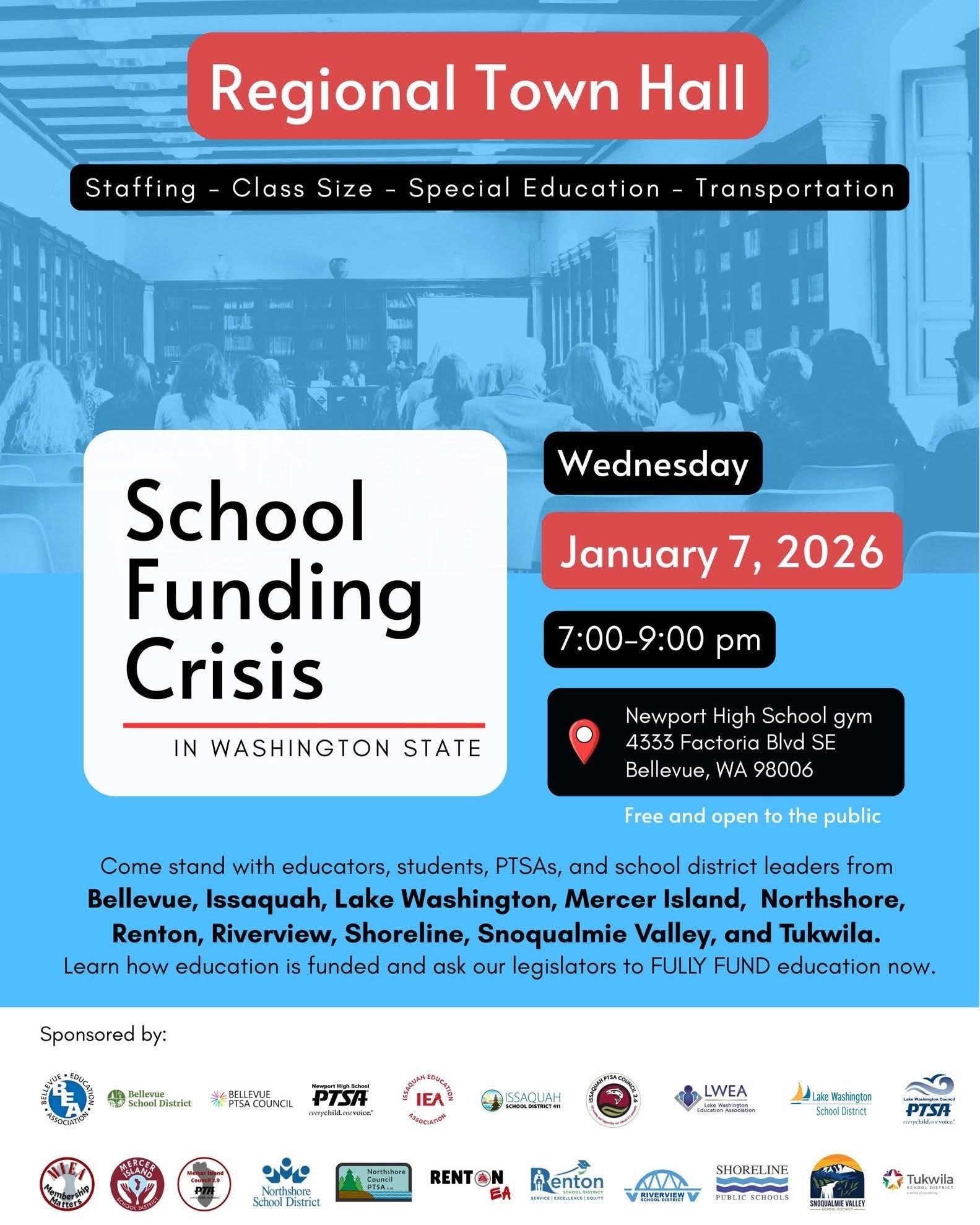 Bellevue, Wash. — As Washington continues to fall short of its paramount constitutional duty to amply fund K–12 public education, a broad coalition of families, students, educators, and statewide leaders will come together for a Regional Town Hall on Education Funding on Wednesday, January 7, 2026, from 7:00–9:00 PM at the Newport High School gym in the Bellevue School District.